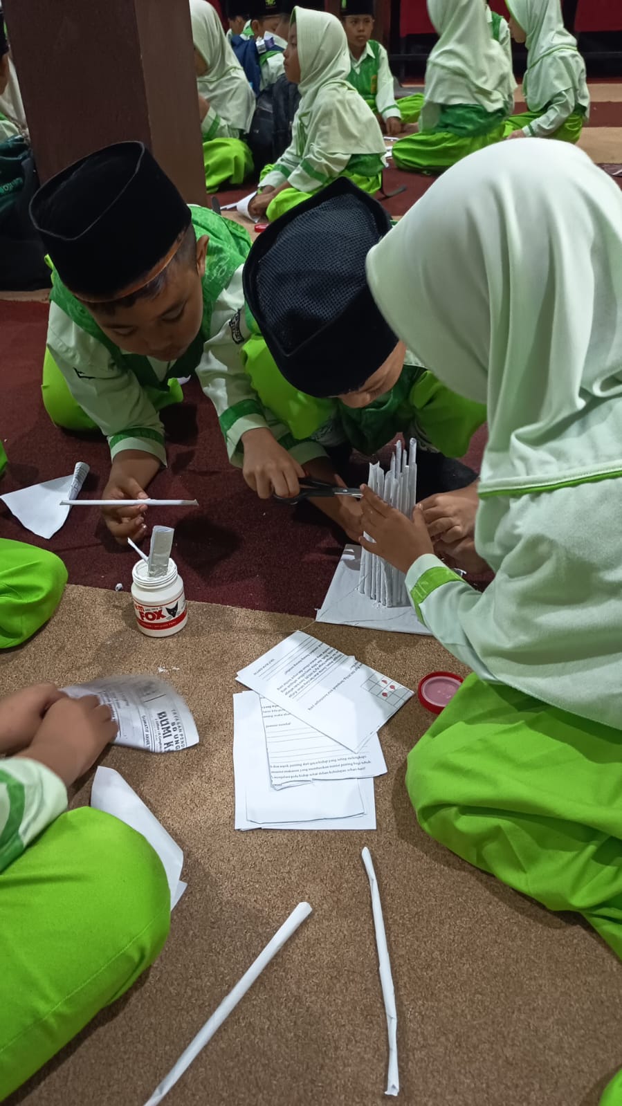Sebagai penutup, siswa mengikuti sesi kreasi bersama Ibu Hesti, pensiunan guru yang kini fokus pada kegiatan pemanfaatan limbah. Dengan penuh keceriaan, anak-anak membuat vas bunga dari kertas bekas yang telah dibawa dari sekolah.